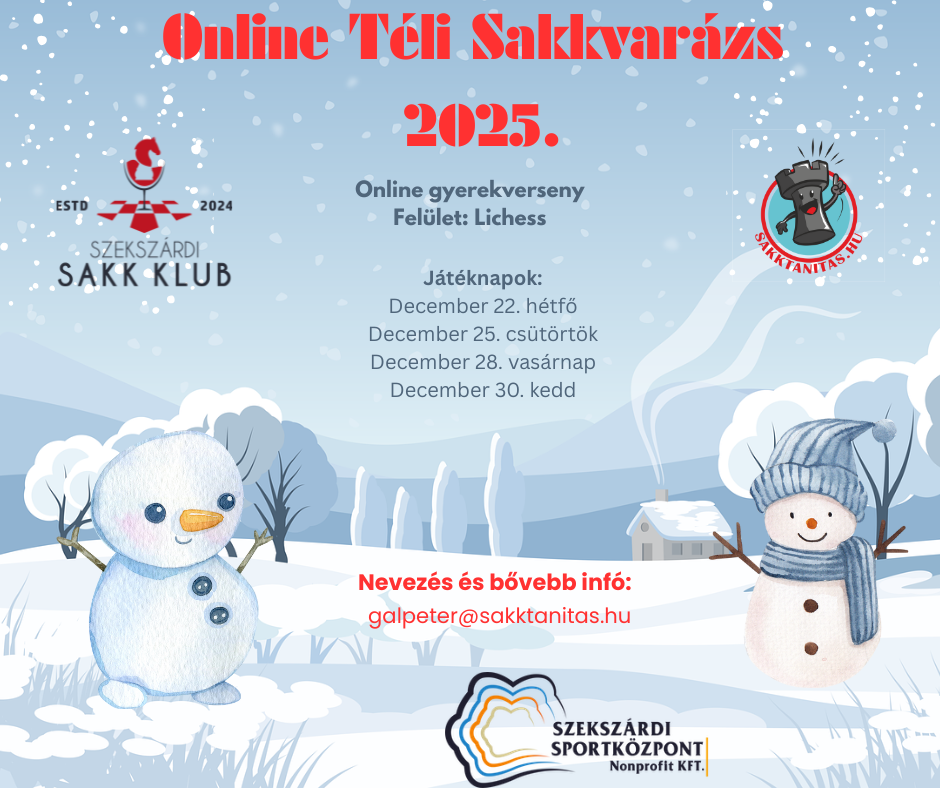 Folytatódik az online gyerekversenyünk a téli szünetben! 4 versenynapos torna lesz, ahol a legjobb 3 eredmény számít majd be az összetettbe. A felület a Lichess, a szervező a Sakktanitas.hu és a Szekszárdi Sportközpont Nkft. (Szekszárdi Sakk Klub).
